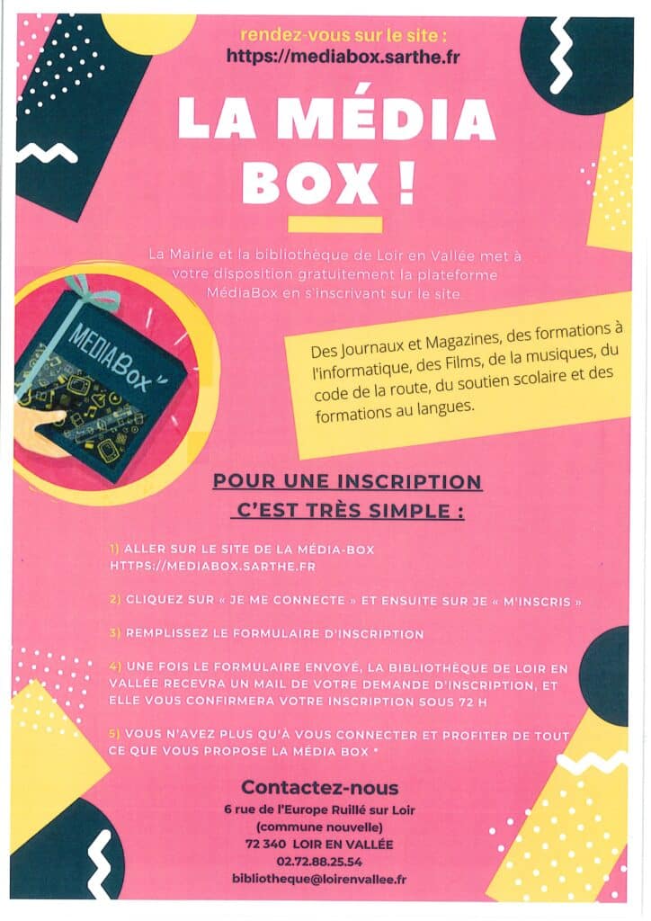 La Mairie et la bibliothèque de Loir en Vallée mettent à votre disposition gratuitement la plateforme MédiaBox en s’inscrivant sur le site
